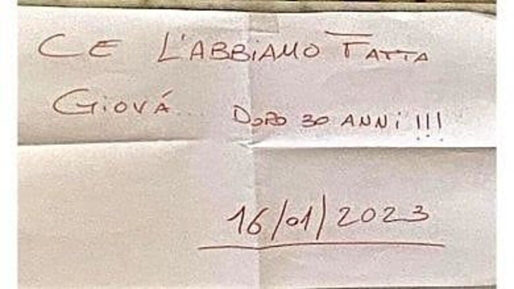 Una foto postata dalla Fondazione Falcone che mostra un foglio bianco posato sulla tomba di Giovanni Falcone. Poche parole, scritte con un pennarello rosso "Ce l'abbiamo fatta Giovà...dopo 30 anni!!!". E poi una data, quella del 16 gennaio 2023. Non c'è una firma ma solo un messaggio che ha lasciato il segno, facendo il giro dell'Italia in pochissime ore. Giovà è Falcone, magistrato italiano ucciso a Palermo il 23 maggio 1992 nella strage di Capaci