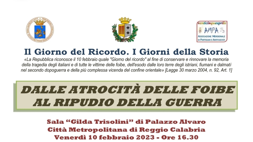In continuità con gli impegni assunti in occasione del Giorno della Memoria prosegue l’attività programmata dalla Città Metropolitana, dal Comune di Reggio Calabria e dall'associazione venticinqueaprile per non dimenticare le tragiche vicende che avvennero lungo il confine tra l’Italia e la Jugoslavia. L’iniziativa, che avrà per tema “Dalle atrocità delle foibe al ripudio della guerra”, vedrà come protagonista, con un intervento registrato, il Prof. Raoul Pupo, docente di Storia Contemporanea dell’Università di Trieste, che recentemente ha pubblicato “Adriatico amarissimo. Una lunga storia di violenze”, libro che si propone di ricostruire i drammatici avvenimenti che ebbero origine già dalla conclusione del primo conflitto mondiale.
