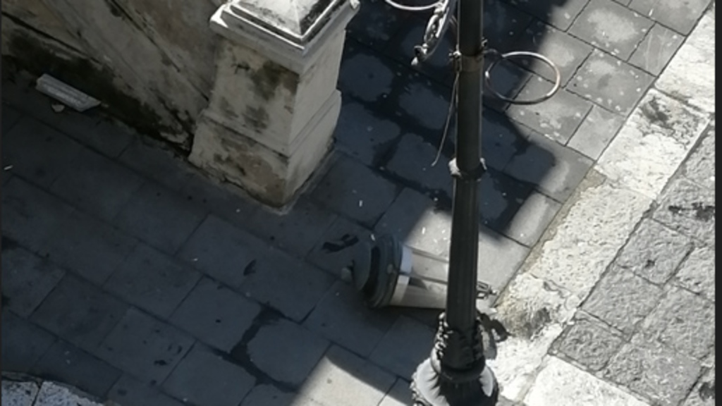 testimonia la caduta di un pezzo dei lampioni che adornano la storica piazza Camagna. Da tempo i residenti evidenziano la richiesta di un intervento per