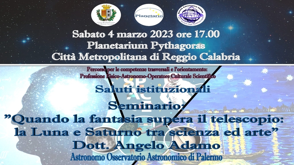 “Quando la fantasia supera il telescopio: la Luna e Saturno tra scienza ed arte” è il titolo suggestivo del seminario che Angelo Adamo, astronomo dell'Osservatorio astronomico di Palermo, terrà al Planetario Metropolitano Pythagoras a partire dalle ore 17.00.