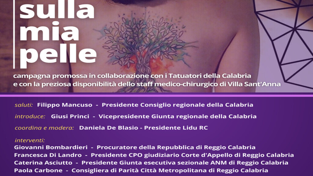 “Insieme ai Presidenti Roberto Occhiuto e Filippo Mancuso, come Regione Calabria ci siamo riproposti di caratterizzare l'8 marzo di ogni anno di Legislatura con azioni concrete a sostegno delle donne. Nel 2022 – spiega il Vicepresidente della Giunta, Giusi Princi - abbiamo varato la Legge regionale contro le discriminazioni delle donne sui luoghi di lavoro. Quest’anno vogliamo lanciare la campagna 'Sulla mia pelle', che aiuterà a coprire, attraverso l’arte del tatuaggio, le ferite che la violenza lascia sulla pelle delle donne che l’hanno subita. Vogliamo far sì che il tatuaggio sulle cicatrici sia simbolo di riscatto della dignità fisica e psicologica di tutte le donne che hanno subito violenza; l’auspicio è che le vittime inizino a volersi più bene, accettando senza timore, con libertà, quella parte fisica che da espressione di dolore diventi emblema di rinascita. Pertanto, abbiamo voluto coinvolgere i tatuatori della Calabria che, gratuitamente, hanno sposato la nostra iniziativa, così come la Direzione sanitaria e lo staff di chirurgia estetica di una nota clinica privata di Reggio Calabria. È bello – conclude Giusi Princi - che proprio giorno 8 marzo parta dalla Calabria un messaggio unitario di sensibilità e di sostegno alle donne vittime di violenza anche attraverso l’arte e la creatività."