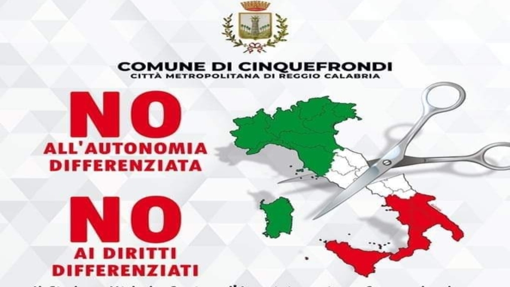 Uniti e uguali, l’Italia non si divide. È da queste premesse, che venerdì 17 marzo, nella data più simbolica per il nostro Paese, quella in cui si celebra l’unità d’Italia, si terrà una manifestazione contro chi l’Italia la vuole disgregare, contro chi servendosi del potere politico vorrebbe accentuare il già innegabile divario in materia di servizi quali sanità, istruzione, stipendi, contro chi anche e soprattutto democraticamente eletto per amministrare le nostre terre, antepone gli interessi di partito ai cittadini che dovrebbe rappresentare. All’evento, al quale hanno aderito delegazioni dalla maggior parte dei comuni meridionali e le principali sigle sindacali e dell’imprenditoria, che si svolgerà a Napoli, città nevralgica del mezzogiorno, sarà naturalmente presente anche una rappresentanza istituzionale del Comune di Cinquefrondi, che per altro ha ricevuto esplicito mandato dal Consiglio Comunale, composta dal Sindaco Michele Conia, dal Presidente del Consiglio Comunale Fausto Cordiano, dalle Assessore Maria Annunziata D’Agostino e Giada Porretta, e dal Consigliere Comunale Giuseppe Luciano. L’occasione, deve compattare in un unico fronte tutte le realtà espressione delle necessità del popolo. Non esiste una battaglia persa in partenza, non esiste un disegno di legge che non si possa rivedere emendare o bocciare, ed è quest’ultima opzione che deve essere per noi fonte di speranza da alimentare con tutti gli strumenti di protesta e opposizione possibili.