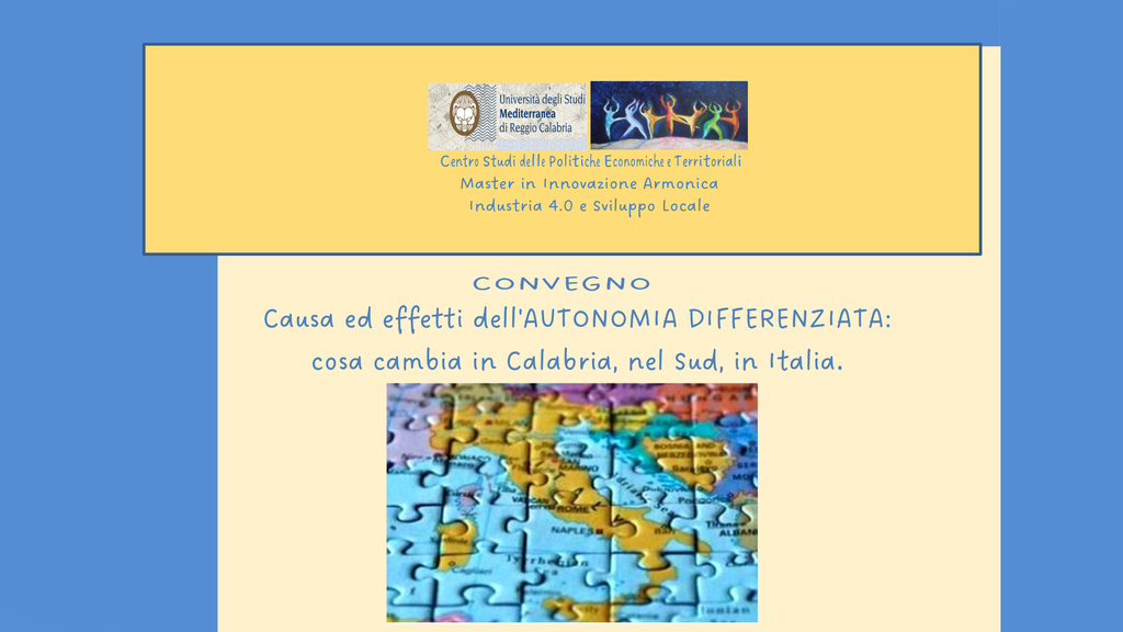 Si parla di Autonomia Differenziata, di come si è arrivati a questa riforma, di com'è la situazione attuale e di cosa cambia con il trasferimento in esclusiva alla Regione “differenziata” di poteri e risorse (finanziarie, umane e strumentali) per 23 materie, dalla sanità alla scuola, dai porti e aeroporti alle strade e autostrade, dalle ferrovie alla ricerca, dall'università ai beni culturali e musei, dai beni ambientali alle soprintendenze, dal lavoro alla previdenza, dalle attività produttive e camere di commercio alla finanza locale, dall'acqua e demanio idrico alla produzione e distribuzione di energia, dal commercio con l’estero all'agricoltura, dalle casse di risparmio alle casse rurali, dalle professioni all’ordinamento sportivo, dalla giustizia di pace alla comunicazione. Ne dà notizia un a nota dell'Università Mediterranea di Reggio Calabria.