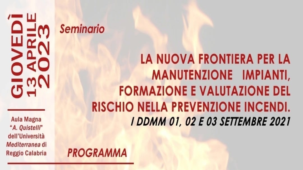 Giorno 13 aprile 2023 alle ore 15:00 si terrà, presso l’Aula Magna “ A. Quistelli “dell’Università Mediterranea di Reggio Calabria, il Seminario tecnico: “La nuova frontiera per la manutenzione impianti, formazione e valutazione del rischio nella prevenzione incendi - i ddmm 01, 02 e 03 settembre 2021”.