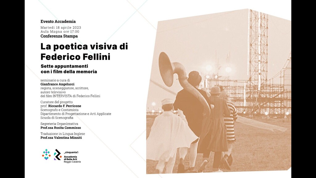 A trent’anni esatti dalla scomparsa del regista Federico Fellini, l’ABARC propone un evento di grande rilievo che prende spunto dai molteplici anniversari riguardanti la sua mirabile produzione: si celebrano i 60 anni del film “8 ½”, i 50 di “Amarcord”, i 40 di “E la nave va”, e si festeggia il trentennale del suo Oscar alla carriera. Una girandola di numeri e date che avrebbero destato l’interesse dello stesso regista, sempre affascinato da coincidenze e sincronicità esoteriche, e che si concretizza nel variegato progetto ideato dal Prof. Riccardo Perricone, scenografo, costumista, docente del Dipartimento di Progettazione e Arti applicate della Scuola di Scenografia dell’Accademia. Per la durata di un mese e cinquanta ore complessive di programmazione, che comprendono la proiezione guidata di sette capolavori del regista, si potrà partecipare all’articolato seminario di Gianfranco Angelucci, scrittore, regista e autore televisivo, sceneggiatore, insieme al maestro, del film “Intervista” di Federico Fellini. Verranno presi in esame i grandi capolavori degli anni Settanta e Ottanta, quelli che, anche dal punto di vista scenografico, offrono il massimo stimolo. Accanto alle citate pellicole da celebrare, infatti, saranno proiettati e analizzati altri quattro titoli di vitale importanza per lo studio della scenografia felliniana e cioè “Fellini Satyricon”, “Roma”, “Casanova” e “Intervista”. Tutte le pellicole in visione saranno arricchite da preziose introduzioni e commenti, materiali d’archivio, interviste e dichiarazioni dello stesso Fellini, oltre che dagli illuminanti, e in qualche caso inediti, backstage.