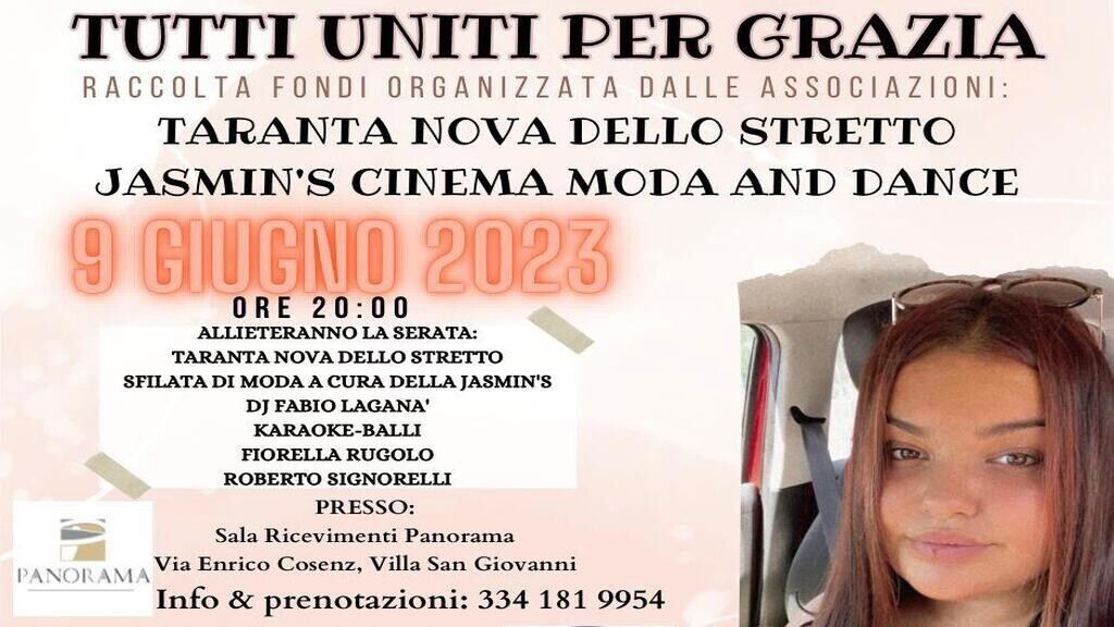 Libera spensierata allegra, regalava emozioni alla famiglia, agli amici e a tutti coloro che le stavano vicino. Una ragazza di sani principi cresciuta con educazione, gentilezza e umiltà, grazie alla sua splendida famiglia, ci narra la sua migliore amica Alessia. Era una ragazzina piccola d’età, ma già grande dentro, si è sempre presa cura dei suoi fratelli come una madre. Fuori casa tra amici, compagni di scuola riusciva sempre a farsi volere bene e circondarsi sempre persone leali, iniziando dalla Calabria dove è cresciuta ed infine a Sarezzo dove attualmente vive. Quest’anno dopo i 18 anni compiuti, Grazia iniziò a manifestare degli svenimenti anomali, in seguito a degli esami approfonditi è stato diagnosticato un tumore al cervello, operata d’urgenza la ragazza non avrebbe dovuto riportare più problemi, ma sarebbe guarita. Non è andata cosi’! Durante l’operazione qualcosa è andata male, Grazia finisce in coma per poi risvegliarsi in uno stato vegetativo, dove oggi dopo tre mesi ci guarda chiude gli occhi e ogni tanto ci regala dei movimenti con il suo meraviglioso sguardo, ci dice la sua migliore amica Alessia che la aspetta giorno dopo giorno per ritornare a vivere la propria gioventu’ insieme a lei. L’organizzazione Tarante Nova dello Stretto gestita da Stefania Laganà nonchè madre della piccola Alessia amica di Grazia insieme alla Jasmin's Cinema Moda and Dance, gestita da Sissi Nasuti, Mery Scafaria e Cetty Scafaria, hanno unito le forze creando una raccolta fondi per Grazia durante un evento di canto, ballo e moda.