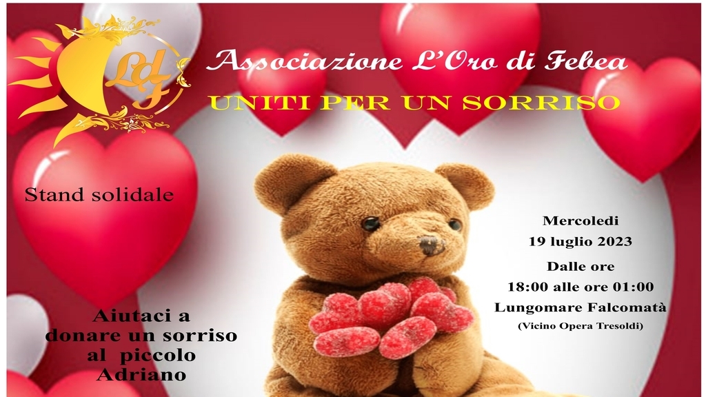 Il prossimo mercoledì, dalle 17.30 in poi, per l’intera serata, sul lungomare di Reggio Calabria, zona Opera Tresoldi, insieme agli stand espositivi degli hobbisti dell'associazione L'Oro di Febea, potrete trovare due stand con tante creazioni artigianali, il cui ricavato della serata, servirà a donare un sorriso al piccolo Adriano e alla sua famiglia.