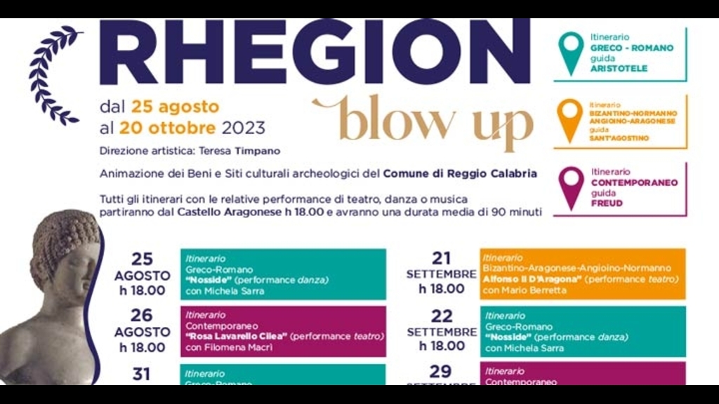 Percorsi turistici che uniscono itinerari nei siti artistico-archeologici della città e performance di teatro, danza o musica: al via oggi “Rhegion Blow Up”, progetto di animazione dei beni e dei siti culturali e archeologici del Comune di Reggio Calabria, promosso dal settore Sviluppo Economico, Cultura e Turismo del Comune di Reggio Calabria, nell’ambito del Por Calabria Fesr 2014/2020 - Asse V, prodotto e realizzato dalla Compagnia Teatrale “Scena Nuda”, con la direzione artistica di Teresa Timpano.