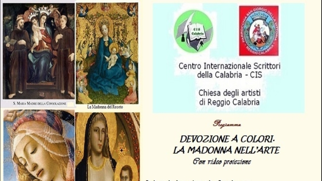 Nello spazio del Chiostro San Giorgio della chiesa degli artisti di Reggio Calabria, il Centro Internazionale Scrittori e la stessa chiesa, mercoledì 6 settembre 2023, alle ore 21:00, promuovono l’incontro “Devozione a colori. La Madonna nell’arte”. Attraverso il contributo di video e di slides relazioneranno: Don Antonio Cannizzaro, parroco della Chiesa di San Giorgio al Corso, Chiesa degli artisti di Reggio Calabria, Teologo; artista Alessandro Allegra, pittore d’Arte Sacra “Iconografia e Iconologia”, responsabile giovani del ciclo del CIS “Quando l’arte incontra il suo immaginario”; prof. Giovanni De Girolamo, critico letterario e d’arte, componente Comitato Scientifico CIS “Quando l’arte incontra il suo immaginario”. Coordina la manifestazione Loreley Rosita Borruto, presidente del Cis della Calabria. In occasione delle prossime feste patronali e in onore della Madonna della Consolazione verranno illustrate, in chiave religiosa, artistica, iconologica, iconografica e storica le immagini della Madonna attraverso le opere più famose di noti artisti del passato e del presente.