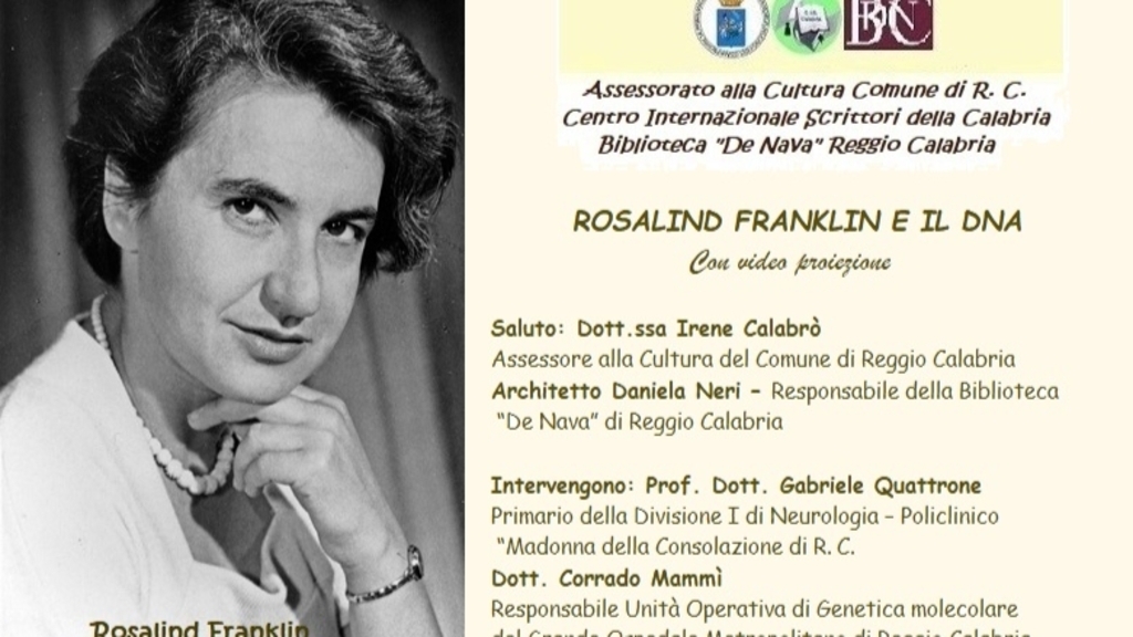 Martedì 10 ottobre 2023, alle ore 16:45, presso la Biblioteca Villetta “P. De Nava”, la Città di Reggio Calabria, il Centro Internazionale Scrittori della Calabria e la stessa Biblioteca, nell’ambito del ciclo di medicina, promuovono la conferenza “Rosalind Franklin e il DNA”. Aprono la manifestazione gli interventi di Irene Calabrò, assessore alla Cultura della Città di Reggio Calabria, di Daniela Neri, responsabile della Biblioteca “De Nava” e di Loreley Rosita Borruto, presidente del Cis della Calabria. Intervengono: Prof. Dott. Gabriele Quattrone, Primario della Divisione I di Neurologia al Policlinico “Madonna della Consolazione di R. C.; Dott. Corrado Mammì, Responsabile Unità Operativa di Genetica molecolare del Grande Ospedale Metropolitano di Reggio Calabria. Durante l’incontro ci sarà un intermezzo musicale a cura dell’insegnante Francesca Anglisano. Rosalind Franklin (Kensington, 25 luglio 1920 – Chelsea, 16 aprile 1958) è stata una grande scienziata che, con le sue scoperte, ha dato un contributo fondamentale per la comprensione della struttura molecolare del DNA. La sua interessante scoperta ha aiutato gli scienziati di tutto il mondo a capire come funzionasse l’ereditarietà delle funzioni genetiche. La Franklin muore a soli 37 anni senza sapere che quattro anni dopo altri ricercatori avrebbero vinto il Nobel per la Medicina grazie, anche, al suo contributo di ricercatrice.