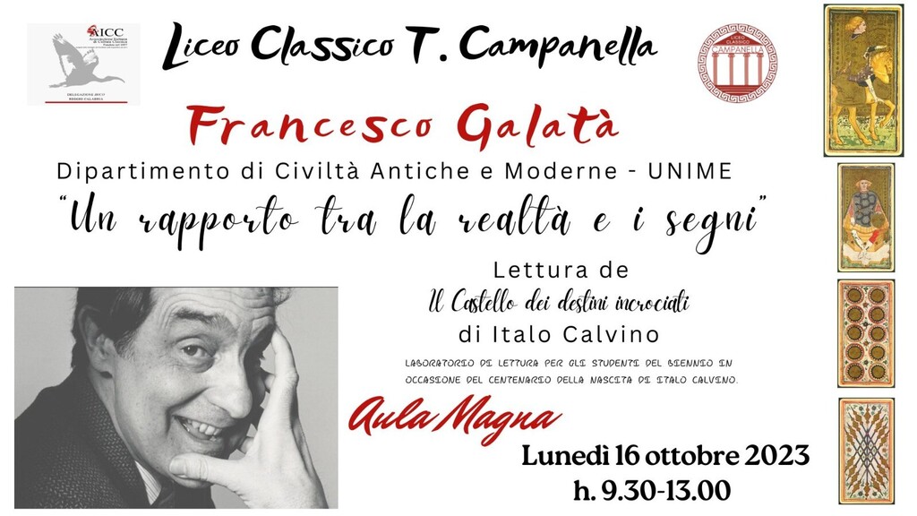 Cento anni dalla nascita di Italo Calvino. Il Liceo Campanella ricorda lo scrittore-editore: l’appuntamento è per le 9 e 30 di lunedì 16 ottobre, data in cui Francesco Galatà, ricercatore del Dipartimento di Civiltà Antiche e Moderne dell’Università di Messina, nell’Aula Magna della scuola, presenterà una riflessione dal titolo “Un rapporto tra la realtà e i segni”, lettura del Castello dei destini incrociati.
