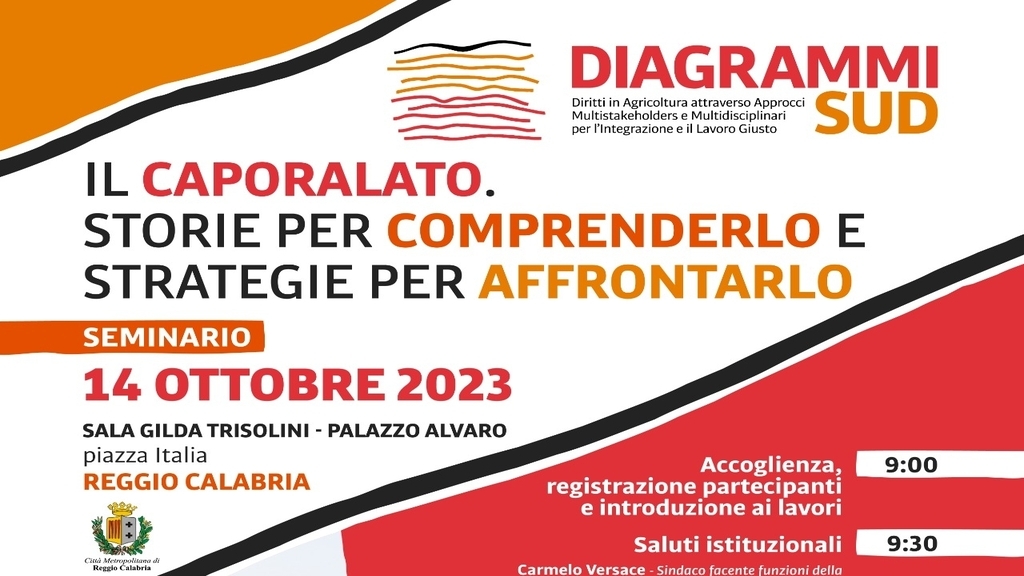 Il seminario, sostenuto dalla Città Metropolitana di Reggio Calabria, è organizzato dalla Cooperativa Sociale "Demetra", partner del Progetto DIAGRAMMI SUD, finanziato dal Pon "Inclusione"- Asse 3 - "Sistemi e modelli di intervento sociale" - priorità di investimento " l'inclusione attiva, anche per promuovere le pari opportunità e la partecipazione a migliorare l'occupabilità" CUP - J19J21008180006, capofila calabrese del progetto la Cooperativa Sociale "Agorà Kroton", capofila nazionale FLAI/CGIL.