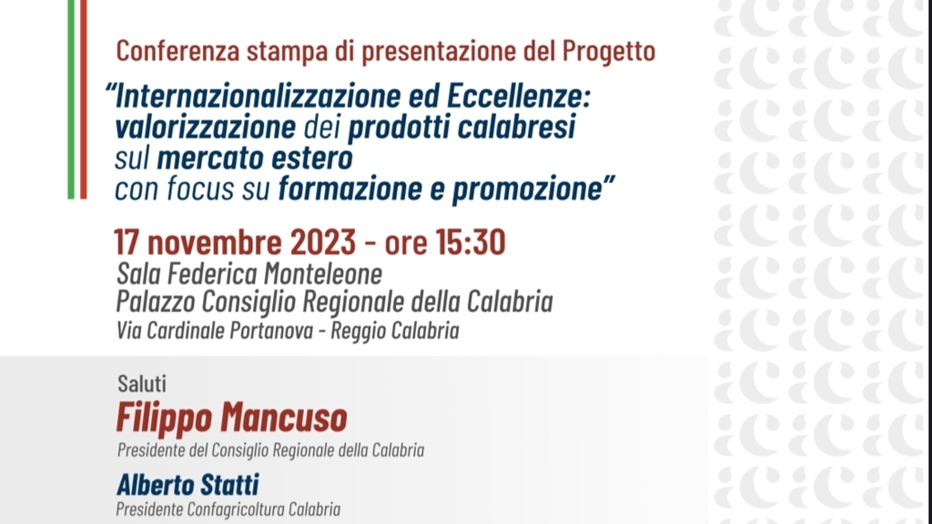 L’incontro di presentazione del progetto “Internazionalizzazione ed Eccellenze: Valorizzazione dei Prodotti Calabresi sul Mercato Estero”, in programma a Roma, nella Sala Nassiriya del Senato, il prossimo 15 novembre, ha già registrato un’adesione eccezionale, con l’esaurimento di tutti i posti disponibili.