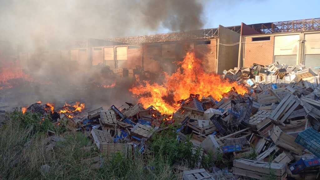 In fiamme diverse cassette di legno e plastica che hanno reso l'aria irrespirabile a causa dell'intensa nube che si è innalzata in cielo.