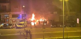 Tre auto in fiamme, Vigili del Fuoco in azione.