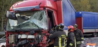 Uno degli occupanti dei camion è stato estratto dai Vigili del Fuoco dal mezzo