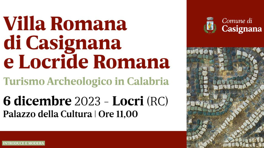 Mercoledì 6 dicembre 2023, ore 11.00, a Locri, nel Palazzo della Cultura, nella sala della mostra “L’incanto del disegno”, si terrà la tavola rotonda sul tema “Villa Romana di Casignana e Locride Romana. Turismo archeologico in Calabria”.