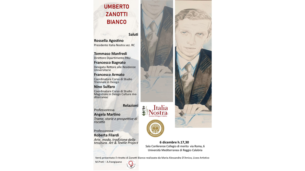 Presso la sala conferenze del Collegio di merito dell’Università mediterranea di Reggio Calabria, il 6 dicembre si terrà il primo incontro di un ciclo di conversazioni dedicate a Umberto Zanotti Bianco, in occasione del sessantennale della sua scomparsa. A riferirlo una nota di Italia Nostra