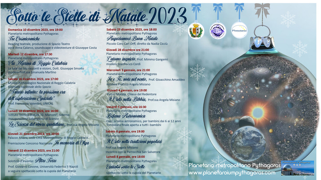 Il Natale è senza dubbio il periodo più suggestivo dell'anno, per il calore, i colori, per la magia delle luci, per l’opportunità di riunirsi in famiglia, per la gioia disegnata nei volti dei bambini. Come ogni anno, il Planetarium Pythagoras organizza un ciclo di eventi dedicati proprio alla festa più attesa dai bambini e dai ragazzi.