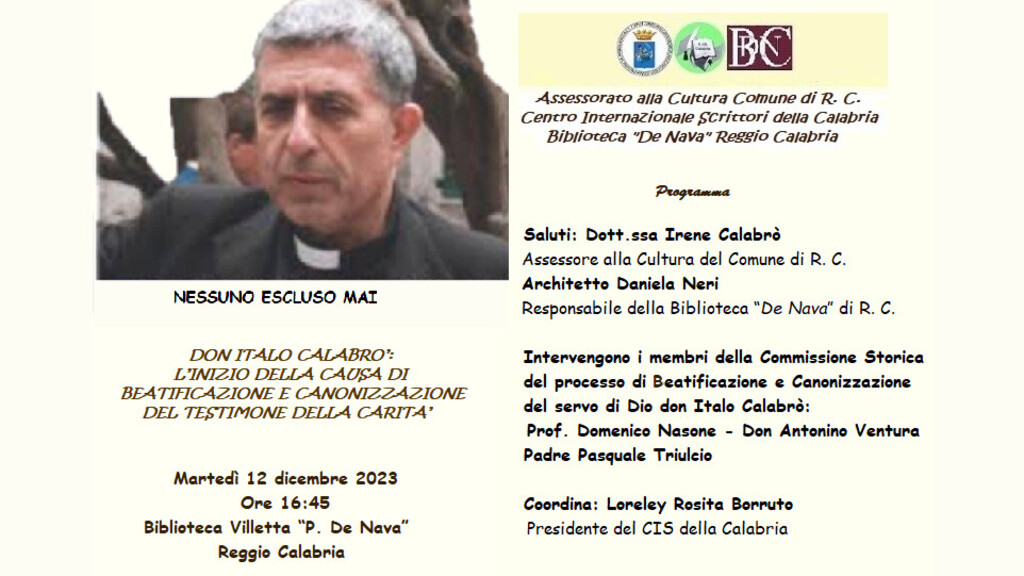 Promosso dal Centro Internazionale Scrittori della Calabria con il patrocinio dell’assessorato alla Cultura del comune di Reggio Calabria, martedì 12 dicembre 2023, alle ore 16:45, presso la Sala conferenze della Villetta “De Nava”, si parlerà di “Don Italo Calabrò: l’inizio della causa di beatificazione e canonizzazione del testimone della carità”. Introducono l’evento Irene Calabrò, assessore alla cultura del comune di Reggio Calabria e Daniela Neri, responsabile della Biblioteca “De Nava”. Intervengono i membri della Commissione Storica del processo di beatificazione e Canonizzazione del servo di Dio don Italo Calabrò: Prof. Domenico Nasone; don Antonio Ventura; padre Pasquale Triulcio.