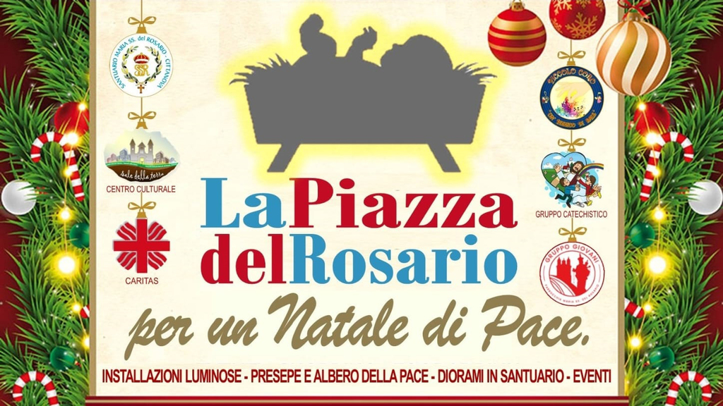 “La Piazza del Rosario per un Natale di Pace”: tra condivisione, comunità e amicizia sincera. Con questo spirito - si legge in una nota -, prenderà il via il 16 dicembre prossimo il programma di attività e iniziative natalizie organizzato e promosso dalla Parrocchia - Santuario del Santissimo Rosario di Cittanova, guidata dal parroco don Salvatore Giovinazzo. Un cartellone intenso e inclusivo che proseguirà fino al 7 gennaio e che vedrà uniti insieme il Centro Culturale “Sale della Terra”, la Caritas Parrocchiale, il Piccolo Coro “Un Pizzico di Sale”, il Gruppo Catechistico e il Gruppo Giovani. Tanti passi sullo stesso cammino di fratellanza e fede; tanti occhi rivolti alla medesima luce di speranza e di impegno comune. Installazioni luminose, Presepe e Albero della Pace, i suggestivi diorami e tantissimi eventi: questo il percorso di comunità allestito dalla Parrocchia del Santissimo Rosario per le famiglie e i giovani.