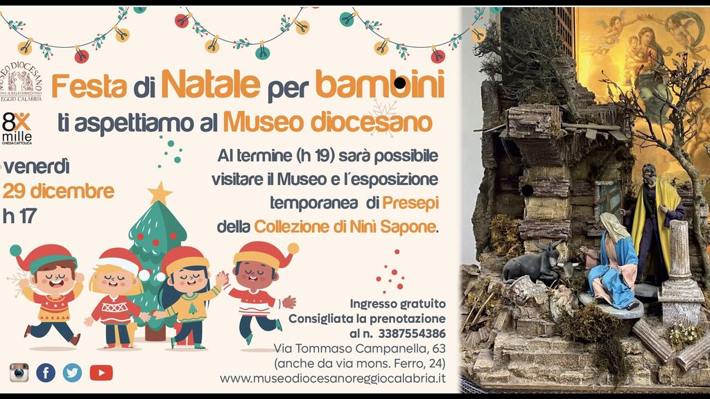 Venerdì 29 dicembre h 17-19 il Museo diocesano di Reggio Calabria attende i bambini per una divertente Festa di Natale, occasione per giochi e attività attorno ai Presepi più belli, dall'Italia e dal mondo, appartenuti alla Collezione di Ninì Sapone, esposti negli spazi museali (consigliata la prenotazione).