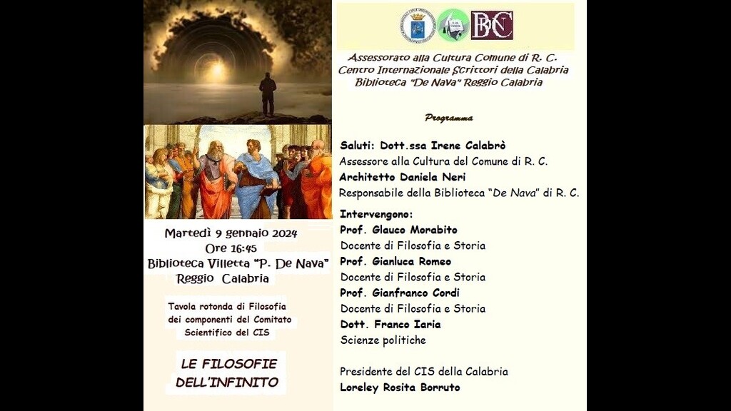 Promossa dal Centro Internazionale Scrittori della Calabria, con il patrocinio dell’assessorato alla Cultura del comune di Reggio Calabria, martedì 9 gennaio 2024, alle ore 16:45, presso la Biblioteca Villetta “De Nava” di Reggio Calabria si terrà la tavola rotonda di filosofia dei componenti del Comitato Scientifico del Cis dal titolo “Le filosofie dell’infinito”. Dopo i saluti istituzionali di Irene Calabrò, assessore alla Cultura del comune di Reggio Calabria, di Daniela Neri, responsabile della Biblioteca “De Nava” e di Loreley Rosita Borruto, presidente del Cis della Calabria, intervengono al dibattito i proff. Glauco Morabito, Gianluca Romeo, Gianfranco Cordi, Franco Iaria. Le filosofie dell’infinito sono teorie filosofiche che si occupano di comprendere il concetto dell’infinito. I relatori illustreranno le differenti posizioni che la storia del pensiero occidentale ha espresso di fronte agli enigmi che l’infinito pone alla ragione umana. Dopo i saluti istituzionali di Irene Calabrò, assessore alla Cultura del comune di Reggio Calabria, di Daniela Neri, responsabile della Biblioteca “De Nava” e di Loreley Rosita Borruto, presidente del Cis della Calabria, intervengono al dibattito i proff. Glauco Morabito, Gianluca Romeo, Gianfranco Cordi, Franco Iaria. Le filosofie dell’infinito sono teorie filosofiche che si occupano di comprendere il concetto dell’infinito. I relatori illustreranno le differenti posizioni che la storia del pensiero occidentale ha espresso di fronte agli enigmi che l’infinito pone alla ragione umana.
