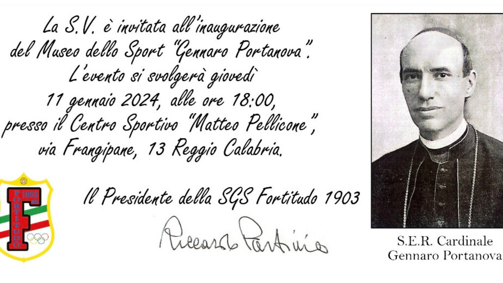 La cerimonia si svolgerà giovedì 11 gennaio 2024, alle ore 18:00, presso il Centro Sportivo “Matteo Pellicone” di Reggio Calabria. Gli Invitati saranno accolti in Palestra dove gli Atleti della “Fortitudo 1903” si esibiranno in azioni tecniche di Judo, Lotta e Karate. Alle ore 18:30, circa, gli Invitati saranno accompagnati nell’area destinata al classico “taglio del nastro” ed ammirare il labaro della Fortitudo 1903, i trofei, le coppe, le targhe, le medaglie, i diplomi di merito, i gagliardetti di gruppi sportivi e rappresentative nazionali di tutto il mondo, i busti in bronzo di Religiosi e Re d’Italia, tutti datati ai primi anni del 1900. Tra i documenti storici custoditi nella Biblioteca del Museo dello Sport “Gennaro Portanova” si potranno visionare le fotografie di eventi e personaggi dello sport, la raccolta di riviste specializzate, i libri, i giornali, le tesi di laurea, le pubblicazioni scientifiche, gli elenchi e le tessere di Soci e di Atleti ed i video di gare nazionali ed internazionali di diverse discipline sportive, in particolare della Ginnastica, della Pesistica, del Judo, della Lotta e del Karate, sin dal loro primo riconoscimento da parte delle Federazioni e del CONI. Tali reperti custoditi dalla “Fortitudo 1903” per oltre 120 anni, riferisce il Presidente Prof. Riccardo Partinico: “rappresentano un valore storico ed artistico unico per la città di Reggio Calabria e rivestono anche un interesse culturale per il loro riferimento con la storia, la religione, la scienza, la politica, la letteratura, la tecnica e la didattica sportiva, quale testimonianza dell’identità nazionale. ” Il Consiglio Direttivo della “Fortitudo 1903” ha nominato Direttrice del Museo dello Sport “Gennaro Portanova” la Prof.ssa Rossella Zoccali, Docente di Storia presso un prestigioso Istituto Scolastico cittadino, anche Atleta, InsegnanteTecnico e Consigliere Sociale della “Fortitudo 1903”. La “Fortitudo 1903” di Reggio Calabria è il più antico e glorioso sodalizio sportivo della Calabria, unica Società Sportiva della Calabria insignita del “Collare d’Oro CONI al Merito sportivo, fondata il 6 gennaio 1903 dal Cardinale Gennaro Portanova che realizzò il progetto salesiano di Don Bosco e di Don Michele Rua finalizzato ad avvicinare i giovani allo sport ed offrire loro un modello di vita corretto.  Alcune date ed eventi storici. Il 10 ottobre 1907 la Fortitudo si esibì con i suoi Atleti presso i Giardini pubblici di Reggio Calabria (oggi Villa Comunale) in presenza di Re Vittorio Emanuele III giunto in città per inaugurare un busto in bronzo di Re Umberto I. Il 25 aprile 1908 morì improvvisamente il Cardinale Gennaro Portanova. Nei giorni 16 e 17 maggio 1908 gli Atleti della Fortitudo parteciparono a Catania ad un Concorso Ginnastico che si svolse presso il Cortile dell’Istituto San Francesco di Sales ed al ritorno in città fu premiata con una targa in bronzo consegnata dalle Autorità durante le feste patronali (Reperto n°2 Museo dello Sport “Gennaro Portanova”). Il 28 dicembre 1908 perirono per la devastazione del terremoto il Presidente Onorario Avv. Diego Vitrioli, il Presidente Effettivo Dott. Pietro La Camera, il Segretario Rag. Domenico Laganà e numerosi Atleti della Fortitudo. Dal 5 all’8 settembre 1909, la ricostituita squadra di Atleti della Fortitudo, prese parte a Milano al Concorso Internazionale di Ginnastica e Sport ricevendo le medaglie di partecipazione. Prima di rientrare in città la Fortitudo fu ricevuta a Roma dal Papa S.S. Pio X che regalò a tutti i ginnasti una medaglia di bronzo. A Palermo, nel 1912, la Fortitudo vinse il Trofeo d’Argento Panormus ricevendo una Coppa ed un Diploma (Reperto n°3 Museo dello Sport “Gennaro Portanova”). Nel 1923 al Politeama di Reggio Calabria “gremito di pubblico intellettuale” riporta il Corriere di Calabria, “la Fortitudo ha incaricato il Prof. Libero Maioli a commemorare Alessandro Manzoni, filosofo, poeta, artista, italiano, nazionalista...Nel 1924 a Firenze la Fortitudo vinse il primo posto nella Ginnastica Artistica esibendosi nell’esercizio “La Piramide Umana” con 111,05 punti su 120. Negli esercizi individuali vinse due medaglie d’argento e quattro di bronzo. L’Allenatore era il Maestro Labate e la notizia della vittoria fu diffusa dal Direttore ginnico-sportivo Cap. Guglielmo Anglani, Nel 1929 a Reggio Calabria la Rappresentativa calabrese costituita anche da Atleti della Fortitudo si contrappose alla Rappresentativa toscana “Unione Sportiva Giovanni Berta” prima dell’incontro di Lotta Greco-Romana tra il campione mondiale Giovanni Raicevich e l’atleta Bernard Bierholz. Nel 1953 la “Fortitudo 1903” organizzò alla Villa Comunale di Reggio Calabria, la finale nazionale di Lotta Greco-Romana del Trofeo Raicevich, patrocinato dalla Gazzetta dello Sport. Presidente della Fortitudo era il Dott. Giulio Romeo. La “Fortitudo 1903” svolge da sempre un’intensa attività a carattere regionale, nazionale e internazionale con particolare specializzazione nelle discipline del Karate, della Lotta, del Judo, della Pesistica e della Ginnastica. Il suo Albo d’Oro è eccezionale e si può sintetizzare in un centinaio di titoli di Campione d’Italia nelle varie specialità praticate e nella partecipazione di Atleti provenienti dalle file dei suoi Soci a Giochi Olimpici, Universiadi, Giochi del Mediterraneo, Campionati Mondiali ed Europei, Tornei Internazionali, in cui hanno conquistato medaglie o dato buona prova di sé, conferendo lustro allo Sport Italiano, Calabrese e Reggino. Nel 1970 la Fortitudo 1903 viene insignita della Stella d’Oro CONI al Merito Sportivo, nel 1982 della Medaglia d’Onore FIJLKAM e FIPE e nell’anno 2007 della massima onorificenza sportiva nazionale, il Collare d’Oro CONI al Merito Sportivo. Hanno ricoperto la carica di Presidente della Fortitudo, dal 1903 al 2020, il Cardinale Gennaro Portanova, l’Avv. Di