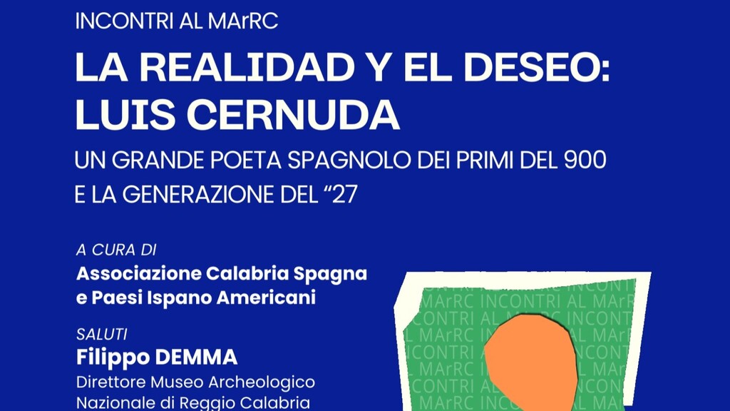 Si terrà al Museo Archeologico Nazionale oggi alle 17:00 la conferenza: "La Realidad Y El Deseo: Luis Cernuda un grande poeta spagnolo dei primi del 900 e la generazione del ’27". L’evento è a cura dell’associazione Calabria Spagna e Paesi Ispano Americani. Dopo i saluti istituzionali di Filippo Demma, Direttore Museo Archeologico Nazionale di Reggio Calabria, interverrà Rosa Fontana Presidente dell’Associazione Calabria-Spagna. La relazione su Cernuda sarà curata del Prof. Domenico Labate, sociologo della comunicazione, già docente dell'Università Mediterranea di Reggio Calabria.