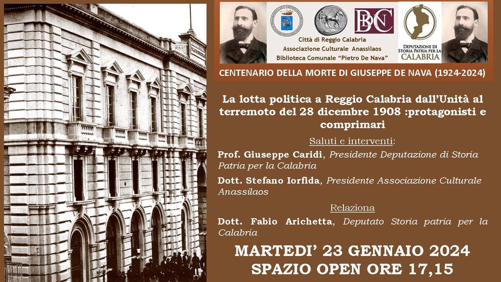 In occasione del Centenario della morte di Giuseppe De Nava (27 febbraio 1924) martedì 23 gennaio alle ore 17,15 presso lo Spazio Open si terrà  un incontro sul tema “La lotta politica a Reggio Calabria dall’Unità al terremoto del 28 dicembre 1908. Protagonisti e comprimari” -che precede le manifestazioni che avranno luogo a febbraio presso la Villetta De Nava  nei pomeriggi di giovedì  8, 15, 22 (inaugurazione di una mostra) e mattina del 27 (commemorazione e presentazione di una speciale cartolina commemorativa) -  promossa dall’Associazione Culturale Anassilaos, congiuntamente con lo stesso Spazio Open e la Biblioteca Pietro De Nava, con il Patrocinio del Comune di Reggio Calabria e della Deputazione di Storia Patria per la Calabria che parteciperà con il suo Presidente Prof. Giuseppe Caridi. Relatore il Dott. Fabio Arichetta, Deputato della stessa Deputazione e studioso di Storia. La vita politica di Reggio Calabria dopo l’Unità d’Italia ( 17 marzo 1861) non era meno complessa e combattiva e astiosa di oggi. La raggiunta unità della Nazione aprì anche a Reggio una nuova fase politica per la città e con il nuovo sistema  parlamentare molti patrioti che avevano lottato per il processo di unificazione ricoprirono diversi ruoli avviando  una lotta politica aspra che si trasformò ben presto in un  conflitto fra notabilati, portatori di interessi divergenti e confliggenti, e pur capaci di trovare alla fine un compromesso. Non tutti però si adattarono alla vita parlamentare. Stefano Romeo lasciò la scena politica dimettendosi da deputato mentre Saverio Vollaro si  votò anima e corpo alla vita parlamentare anche perché la nuova Italia richiedeva agli eletti di impegnarsi a favore del proprio territorio affinché gli interessi particolari trovassero in sede nazionale una sia pur parziale soddisfazione. Agostino Plutino, finanziatore e promotore dell’impresa dei Mille, fu ad esempio  promotore di numerosi significativi interventi a favore della realizzazione di opere pubbliche in Calabria e a Reggio. Ben più aspra, a volte violenta, fu invece la lotta politica a livello amministrativo. Gli ultimi anni dell’Ottocento e i primi del Novecento (fino al dicembre 1908) si caratterizzarono infatti sotto il profilo politico-amministrativo per la presenza dei fratelli Tripepi. Liberali moderati lontani dall’estremismo anticlericale, anzi disponibili a buoni rapporti con la Chiesa reggina e con il suo Arivescovo Cardinale Gennaro Portanova, Domenico Tripepi (1853/1905), Demetrio Tripepi (1859/1908) e Francesco Tripepi (1857/1901) dominarono la scena politica a Reggio Calabria e Provincia ricoprendo ruoli significativi tra cui (Domenico e Demetrio) quello di Sindaci del Capoluogo. Essi diedero vita a quello che fu chiamato il partito dei “tripepini”  cui si contrappose sempre lo schieramento radicale e anticlericale facente capo al deputato Biagio Camagna detto dei “Camagnoti” o “Camagnini”. Morto l’11 gennaio del 1905 Domenico Tripepi,  che strinse cordiali rapporti con la Chiesa Reggina restituendo ad essa il Santuario dell’Eremo,  la guida dei liberali moderati e cattolici fu assunta da Demetrio, sindaco nel 1905/1907. Le beghe politiche locali e l’influenza di Biagio Camagna, uomo vicino al Presidente del Consiglio Giovanni Giolitti, portarono nel febbraio del 1907 alla revoca  dalle funzioni del Sindaco Demetrio Tripepi  e poco più tardi (marzo 1907) allo scioglimento del Consiglio Comunale. Le elezioni che seguirono il 21 luglio dello stesso anno furono tra le più accese e combattute nella storia di Reggio Calabria. Vi furono tafferugli, cariche delle forze dell’ordine, accuse di brogli. Grazie comunque all’alleanza con il mondo cattolico e con il Cardinale Portanova (accordo del 3 luglio 1907) lo schieramento moderato  sconfisse duramente  i democratici radicali di Camagna (27 consiglieri su quaranta). Seguirono violenze a aggressioni nei confronti di esponenti politici cattolici e dello stesso Cardinale. Non potendo fare il Sindaco per la sospensione dalle funzioni Demetrio Tripepi fu eletto, con un escamotage,  pro-sindaco e in tale veste accolse il 10 ottobre 1907 Vittorio Emanuele III in visita alla Città. In Consiglio Comunale ci furono in quella occasione scontri feroci e scambi di accuse  tra Tripepi e  Camagna. A quest’ultimo che riteneva non decoroso che ad accogliere il sovrano fosse un pro-sindaco destituito dal Governo, Tripepi rinfacciò tutte le malefatte, vere o presunte,  costringendolo a lasciare la sala. Nei mesi successivi lo scontro politico  si mantenne sempre vivace e ad  esso mise purtroppo fine il terremoto che il 28 dicembre atterrò Reggio Calabria e nel quale morì lo stesso Demetrio Tripepi.