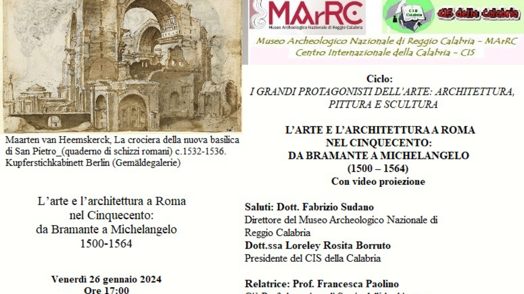 “L’arte e l’architettura a Roma nel Cinquecento. Da Bramante a Michelangelo” (1500 – 1564) è il titolo della conferenza promossa dal Museo Archeologico Nazionale di Reggio Calabria e dal Centro Internazionale Scrittori della Calabria, venerdi 26 gennaio, alle ore 17:00, presso la Sala conferenze del Museo. Aprono l’incontro gli interventi di Fabrizio Sudano, direttore del MArRC e di Loreley Rosita Borruto, presidente del Cis della Calabria. Con il contributo di slides, relaziona Francesca Paolino, già prof. associato di Storia dell’Architettura dell’Università Mediterranea di Reggio Calabria, componente del Comitato Scientifico del Cis. La relatrice con il supporto di video Proiezione illustrerà l’arte e l’architettura del Cinquecento a Roma da Bramante a Michelangelo. Il Rinascimento è stato il periodo più ricco della storia delle Arti italiane. Molti studiosi stranieri hanno indagato con rigoroso metodo scientifico e passione autentica la storia della produzione artistica italiana del Rinascimento. I più importanti sono stati Wolfang Lotz, Ludwig H. Heydenreich, Rudolf Wittkower, Peter, Murray, James, S. Ackerman. Il primato artistico italiano si è avuto quando il centro propulsore si sposta da Firenze a Roma perché è qui che può compiutamente e direttamente avverarsi l’esperienza dell’Antico, benché i padri fondatori del primo Rinascimento fiorentino ne avessero avuto già piena contezza. Con Giulio II (1503-1513) inizia la Renovatio Urbis che afferma e concretizza il primato politico e culturale del Papato e proseguirà almeno per i due secoli successivi (XVI-XVII) e renderà Roma unica e irripetibile.