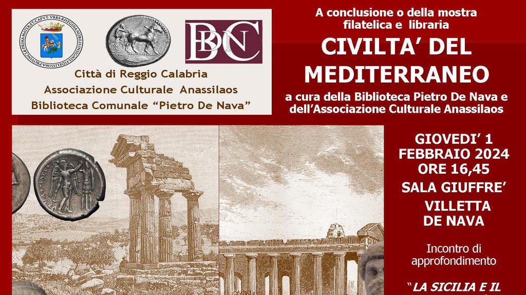 A conclusione della mostra libraria e filatelica “Civiltà del Mediterraneo/per servire alla Pace” presso la Villetta De Nava, si terrà giovedì 1 febbraio con inizio alle ore 16,45 presso la Sala Giuffrè della Villetta De Nava, il sesto e ultimo approfondimento sulla storia antica promosso dall’Associazione Culturale Anassilaos, congiuntamente con la Biblioteca “Pietro De Nava”, e patrocinato dal Comune di Reggio Calabria. Tema della lezione del Prof. Luigi Maria Caliò,  Associato di Archeologia Classica  presso il Dipartimento di Scienze Umanistiche  dell’Università di Catania “La Sicilia e il Mediterraneo tra IV e III secolo a.C: le fonti archeologiche”. Lo studioso ha partecipato a importanti scavi a Camiro (Rodi), a Gortyna (Creta), a Castiglione di Paludi (Cosenza), Larino (Campobasso), al Santuario di Saturo (Taranto), e dal 2012 a oggi ad Agrigento con  loscavo del Tempio ellenistico-romano presso l’area centraledella città che prevede lo studio topografico, lo studio dell’architettura e della ceramica, lo scavo a Byllis evalle del Vlora (Albania), e ancora i progetti Egnazia e Pompei. La conversazione verterà sulla Sicilia che tra il regno di Agatocle e quello di Ierone vive una fortunata stagione.Le città crescono di numero e si monumentalizzano; nuovi spazi celebrano i regnanti e creano quinte alle grandi manifestazioni pubbliche. Agrigento realizza il proprio edificio teatrale all'interno di una delle piazze più grandi del Mediterraneo e altre città realizzano ampie agorai, ginnasi, portici, templi. Tuttavia la Sicilia si trova protagonista di conflitti terribili e partecipa attivamente alle vicende della guerra annibalica. Il contrasto tra Romani e Cartaginesi, l'organizzazione della provincia, la resistenza del regno di Ierone offrono all'archeologo un interessante campo di indagine nel quale diversi approcci culturali trovano alla fine del III secolo una nuova sintesi che si può leggere negli esiti urbani e architettonici. In occasione dell’incontro prosegue l’esposizione al pubblico dell’opera del canonico e cantore del Duomo il reggino Giuseppe Morisani,  le cui “Inscriptiones Reginae dissertationibus inlustrate” o “Marmora regina dissertationibus inlustrata” (1770) costituiscono un’opera fondamentale per conoscere la storia di Reggio. Condurrà il Prof. Amos Martino, Responsabile Anassilaos.