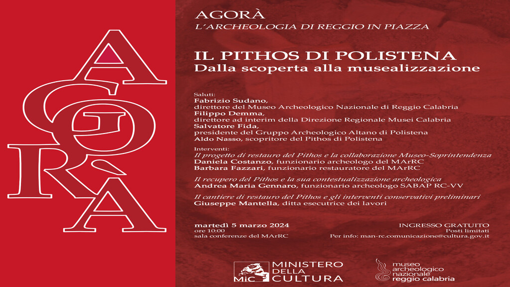 Martedì 5 marzo 2024 alle ore 10:00 presso la Sala Conferenze del MArRC si terrà la conferenza “Il pithos di Polistena: dalla scoperta alla musealizzazione”. Nell’ambito della proficua collaborazione tra il MArRC e la SABAP RC-VV, è nato il progetto di restauro di un pithos (vaso contenitore di grandi dimensioni), ritrovato fortuitamente presso il territorio di Polistena nel 2019, che si concluderà con l’esposizione dello stesso presso le sale museali del Museo. Si tratta di un pithos di tipo reticolato che, per genere e forma, risale alla media età del Bronzo. Esso rappresenta un unicum archeologico in quanto è il ritrovamentodella facies Thapsos/Milazzese più settentrionale che attualmente si conosce.