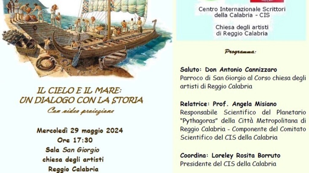 Mercoledì 29 maggio 2024, alle ore 17:30, presso la Sala conferenze della Chiesa di San Giorgio, chiesa degli artisti di Reggio Calabria, il Centro Internazionale Scrittori della Calabria e la stessa chiesa, promuovono la conversazione: “Il cielo e il mare: un dialogo con la storia”. Introducono la manifestazione don Antonio Cannizzaro, parroco di San Giorgio al Corso e Loreley Rosita Borruto, presidente del Cis della Calabria. Relatrice dell’incontro sarà la Prof. Angela Misiano, responsabile Scientifico del Planetario “Pythagoras” della Città Metropolitana di Reggio Calabria, componente del Comitato Scientifico del CIS della Calabria.