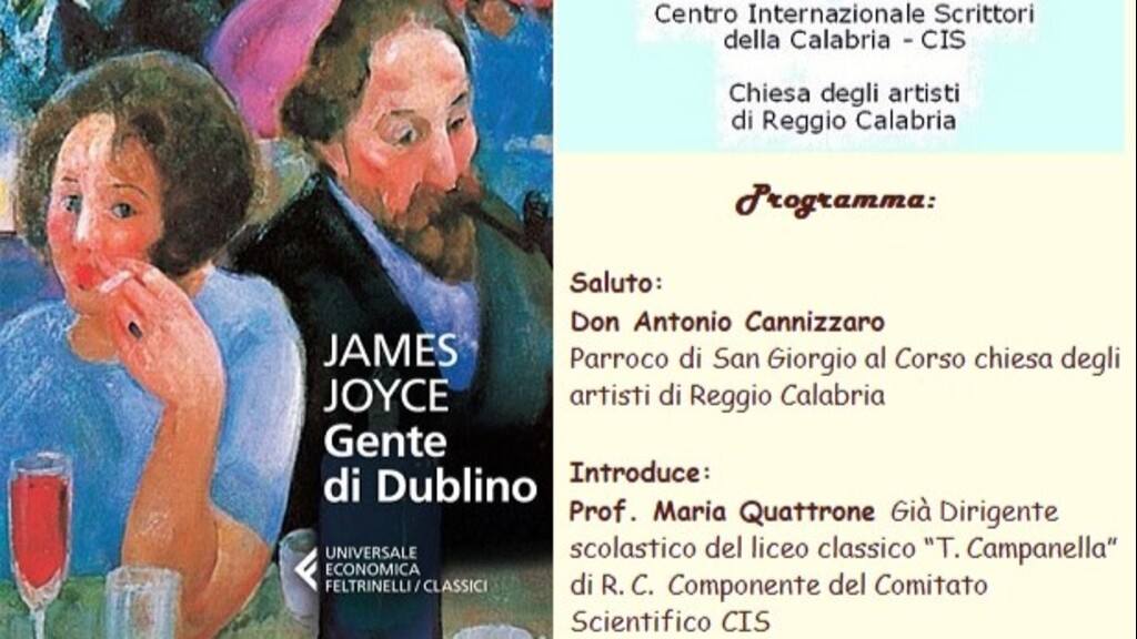Il Centro Internazionale Scrittori e la chiesa degli artisti di Reggio Calabria, mercoledì 24 luglio 2024, alle ore 21:00, presso il Chiostro di San Giorgio al Corso, nell’ambito del ciclo di letteratura mondiale di lingua inglese, presentano il volume: “Gente di Dublino” di James Joyce. Aprono l’incontro don Antonio Cannizzaro, parroco della chiesa di San Giorgio, e Loreley Rosita Borruto, presidente del Cis della Calabria. Introduce il tema della manifestazione Maria Quattrone, già Dirigente scolastico del liceo classico “T. Campanella” di Reggio Calabria. Con il contributo di slides relaziona Silvana Comi, prof. di Lingue e Letteratura Inglese, componente del Comitato Scientifico del CIS. James Joyce (Dublino, 1882 – Zurigo, 1941) è stato scrittore, poeta e drammaturgo. “Gente di Dublino" è spesso considerata una delle opere più importanti di Joyce e ha avuto un'influenza significativa sulla letteratura moderna. “Gente di Dublino” (1914) sono dei racconti che rappresentano storia e costume di vita della città. Attraverso diverse tematiche, Joyce esplora diversi temi come la solitudine, la frustrazione e la mancanza di comunicazione che affliggono i personaggi di queste storie.