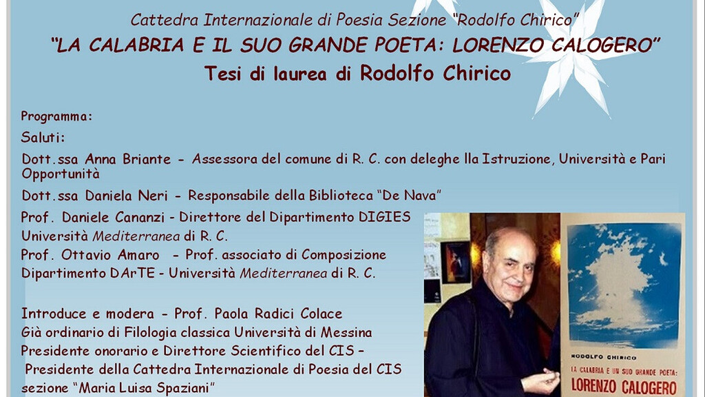 Promosso dal Centro Internazionale Scrittori della Calabria con il patrocinio del comune di Reggio Calabria e dell’Università Mediterranea di Reggio Calabria, martedì 27 agosto 2024, alle ore 18:00, presso la Sala “Garcilaso” del Castello Aragonese di Reggio Calabria, nell’ambito degli eventi inseriti nella “Cattedra di poesia internazionale del CIS intitolata a Yves Bonnefoy, Maria Luisa Spaziani e Rodolfo Chirico”, sarà promosso l’evento: “La Calabria e il suo grande poeta Lorenzo Calogero” tesi di laurea di Rodolfo Chirico.