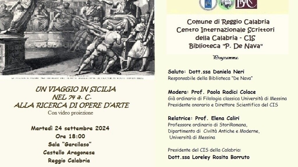 “Un viaggio in Sicilia nel 74 a. C. alla ricerca di opere d’arte” è il titolo della conferenza promossa dal Comune di Reggio Calabria, dal Centro Internazionale Scrittori della Calabria e dalla Biblioteca “De Nava” che si svolgerà martedì 24 settembre 2024, alle ore 18:00, presso la Sala “Garcilaso” del Castello Aragonese di Reggio Calabria. Dopo i saluti di Daniela Neri, responsabile della Biblioteca “De Nava”, e di Loreley Rosita Borruto, presidente del CIS della Calabria, modera la manifestazione Paola Radici Colace, già prof. ordinario di Filologia classica Università di Messina, presidente onorario e direttore Scientifico del CIS.