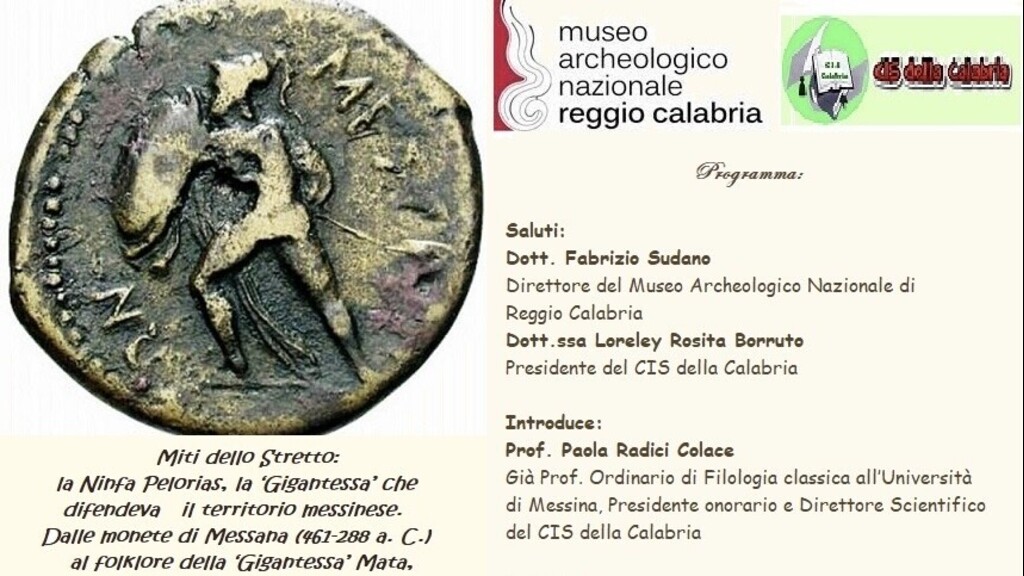 Mercoledì 16 ottobre 2024, alle ore 17:30, presso la lo stesso Museo e il Centro Internazionale Scrittori della Calabria promuovono la conferenza: “Miti dello Stretto: la Ninfa Pelorias, la ‘Gigantessa’ che difendeva il territorio messinese,dalle monete di Messana (461-288 a. C.) al folklore della ‘Gigantessa’ Mata, fondatrice della città”. Dopo i saluti di Fabrizio Sudano, direttore del Museo Archeologico Nazionale di Reggio Calabria, e di Loreley Rosita Borruto, presidente del Cis della Calabria, introduce l’incontro Paola Radici Colace, già professore ordinario di Filologia Classica, Dipartimento di Civiltà Antiche e Moderne, Università di Messina, presidente onorario e direttore scientifico del CIS. Con il contributo di slides relaziona Maria Caccamo Caltabiano, già Prof. Ordinario di Numismatica greca e romana, Dipartimento di Civiltà Antiche e Moderne, Università di Messina, componente del Comitato Scientifico del CIS. La Ninfa Pelorias era una dea di gigantesca natura, figura leggendaria che difendeva il territorio dello Stretto.