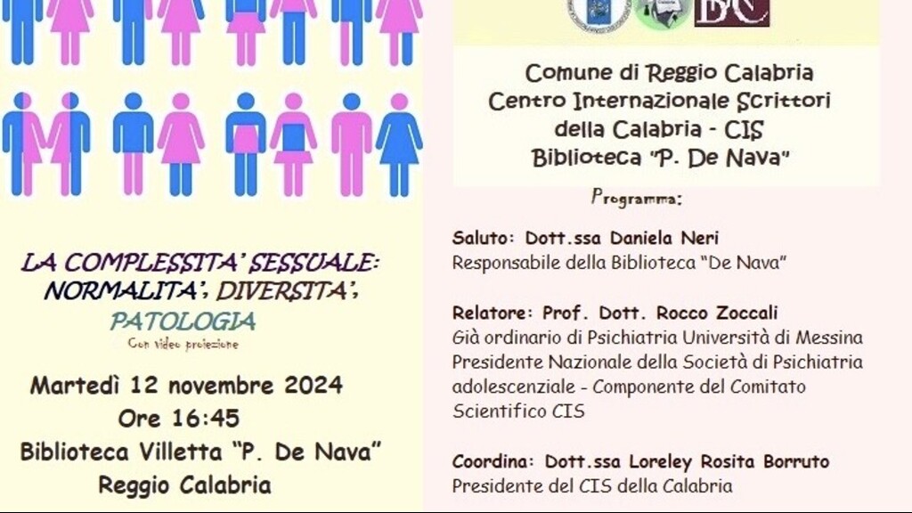 Il Centro Internazionale Scrittori della Calabria, con il patrocinio del Comune di Reggio Calabria, martedì 12 novembre 2024, alle ore 16:45, presso la Biblioteca Villetta “De Nava” di Reggio Calabria, promuove la conferenza “La complessità sessuale: normalità, diversità, patologia” a parlarne sarà il prof. Dott. Rocco Zoccali. Dopo i saluti di rito della dott.ssa Daniela Neri, responsabile della Biblioteca “De Nava” e della dott.ssa Loreley Rosita Borruto, presidente del CIS della Calabria, il prof. dott. Rocco Zoccali, con il contributo di slides, parlerà della complessità sessuale, l’argomento sarà trattato in chiave neurobiologica, psicologica e socioculturale, con lo scopo di fornire un significato il più scientifico possibile anche se, tutt’oggi, non si hanno certezze in merito.