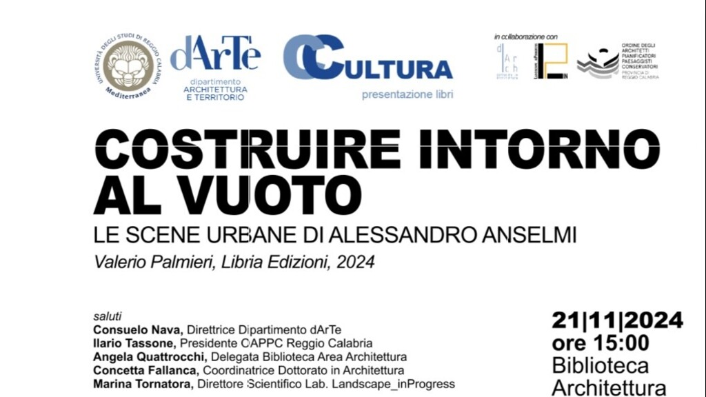 Giovedì 21 novembre alle ore 15:00 presso la sala della biblioteca del dip. dArTe -UNIRC, ci sarà la presentazione del libro di Valerio Palmieri Costruire intorno al vuoto. Le scene urbane di Alessandro Anselmi, Libria ed. 2024
