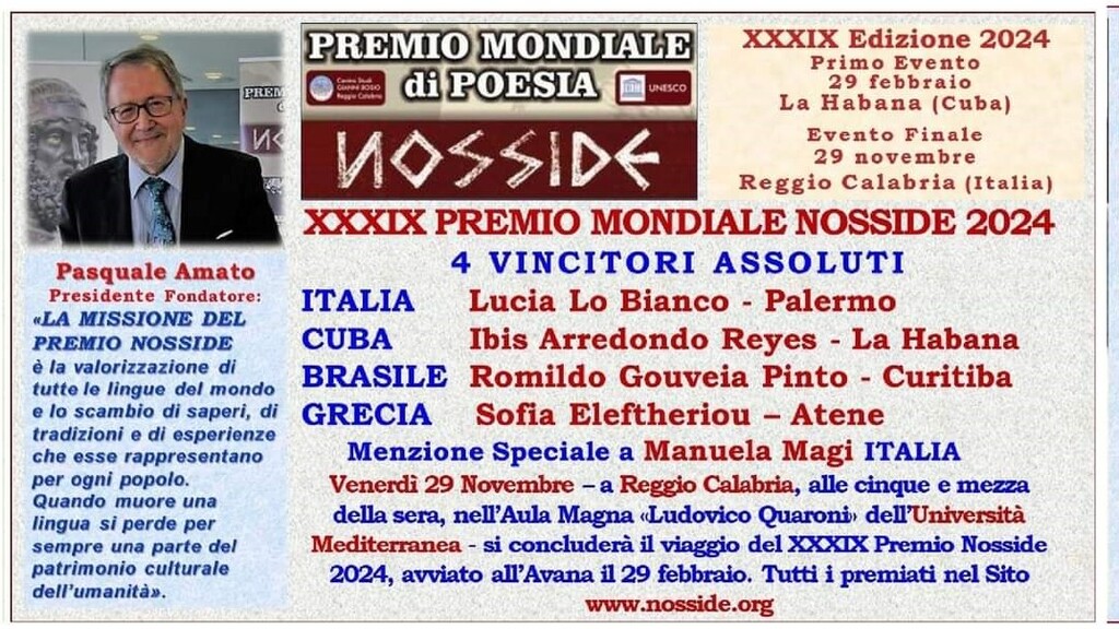 Venerdì 29 novembre alle 17,30 nell’Aula Magna “Ludovico Quaroni” dell’Università Mediterranea di Reggio Calabria si concluderà il viaggio del XXXIX Premio Mondiale di Poesia Nosside iniziato il 29 febbraio all’Avana (Cuba) con tappe nell’Accademia Gourmet di Filippo Cogliandro a Reggio Calabria, nella Biblioteca Civica di Lentini e nel Palazzo Ducale di Genova.