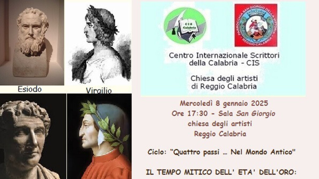 Nell’ambito del ciclo “Quattro passi…Nel Mondo Antico”, il Centro Internazionale Scrittori della Calabria–CIS e la Chiesa degli Artisti di Reggio Calabria, mercoledì 8 gennaio 2025, alle ore 17:30, nel Salone San Giorgio della stessa chiesa, promuovono la conferenza “Il tempo mitico dell’età dell’oro: Esiodo, Virgilio, Orazio, Ovidio, Dante”.