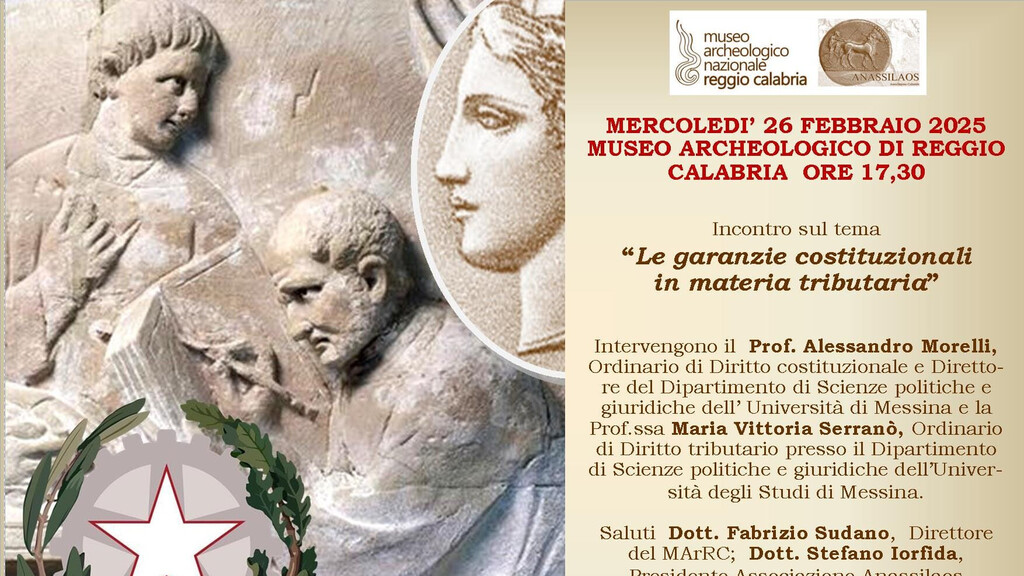 “Le garanzie costituzionali in materia tributaria” è il tema di un seminario promosso dall’Associazione Culturale "Anassilaos" che si terrà mercoledì 26 febbraio alle ore 17,30 nella Sala del Museo Archeologico di Reggio Calabria, nell’ambito degli incontri presso il MARC, con la partecipazione del  Prof. Alessandro Morelli, Ordinario di Diritto costituzionale e Direttore del Dipartimento di Scienze politiche e giuridiche dell’Università di Messina e della Prof.ssa Maria Vittoria Serranò, Ordinario di Diritto tributario presso il Dipartimento di Scienze politiche e giuridiche dell’Università degli Studi di Messina.