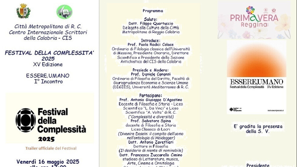 Dopo i saluti di Filippo Quartuccio, consigliere delegato alla Cultura della Città Metropolitana di Reggio Calabria, e di Loreley Rosita Borruto, presidente del CIS della Calabria, introduce l’evento Paola Radici Colace, già ordinario di Filologia classica dell’Università di Messina. Presiede e modera la tavola rotonda Daniele Cananzi, professore di Filosofia del Diritto e Teoria dell’interpretazione, direttore del DiGiES, Dipartimento di Giurisprudenza dell’Università Mediterranea di Reggio Calabria, e partecipano: Salvatore Spina, docente di Filosofia e Storia al Liceo Classico di Locri che parlerà sul tema (Divenire Dasein: il compito dell’uomo nell’ontologia di Heidegger); Antonio Giuseppe D’Agostino, docente di Filosofia e Storia al Liceo Scientifico “L. Da Vinci” e Liceo Scientifico “A. Volta” di Reggio Calabria. tratterà il tema (“Complessità e diversità); Antonio Zavettieri, dottore in Filosofia, che illustrerà il tema (Il desiderio di niente di nominabile); Francesco Zuccarello Cimino, studioso di Letteratura, musica, Arte, Cinema e Ornitologia si soffermerà sul tema (L’uomo al centro dell’Universo). Economia e Scienze Umane, Università degli Studi ‘Mediterranea’ di Reggio Calabria. Durante la manifestazione sarà proiettato il Trailer ufficiale del Festival della Complessità 2025.