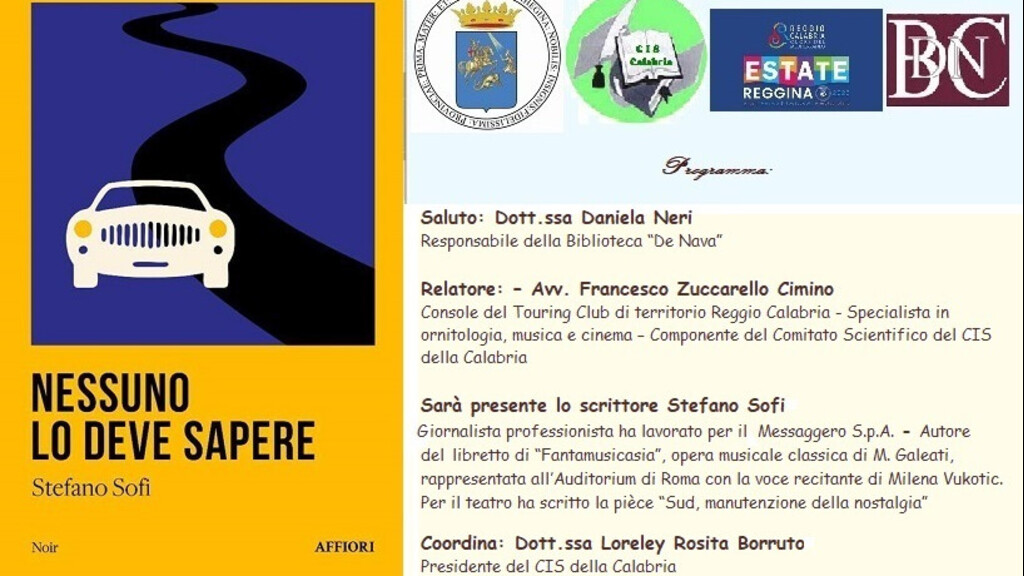 Martedì 5 agosto 2025, alle ore 18:00 presso la Biblioteca Villetta “P. De Nava” di Reggio Calabria, nell’ambito della “Estate Reggina 2025”, il Comune di Reggio Calabria, il Centro Internazionale Scrittori della Calabria (CIS) e la Biblioteca “De Nava” promuovono la presentazione del romanzo noir “Nessuno lo deve Sapere” di Stefano Sofi.