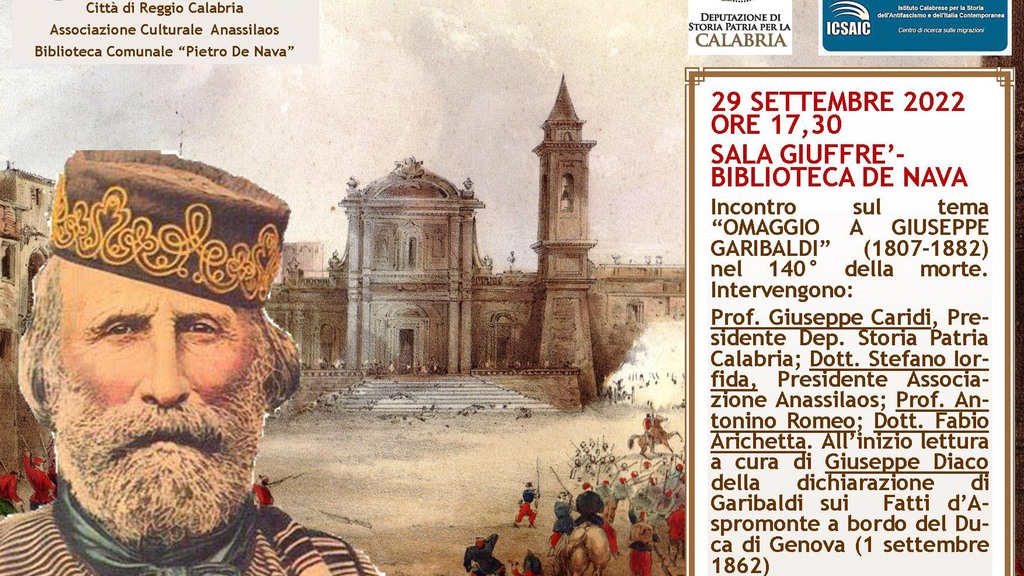 La figura di Giuseppe Garibaldi, nel 140° anniversario della morte (2 giugno 1882) sarà al centro di un incontro, promosso dall’Associazione Culturale Anassilaos, congiuntamente con la Biblioteca “Pietro De Nava” di Reggio Calabria, che si terrà giovedì 29 settembre alle ore 17,30 in Reggio Calabria presso la Sala Giuffrè della Biblioteca.