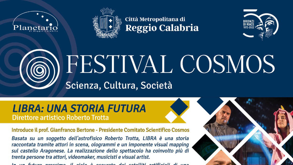 Lo spettacolo, che si terrà nella prima serata del Festival Cosmos 2022, sarà il primo evento aperto a tutti, dopo le attività della mattina dedicate alle scuole con le conferenze tenute dalla professoressa Lucia Votano a Palazzo Alvaro "Juno, l'esperimento su cui non tramonta mai il sole" e dal professor Pierluigi Veltri, al Palazzo della Cultura di Locri, "La rappresentazione dell'universo da Aristotele ad Einstein".