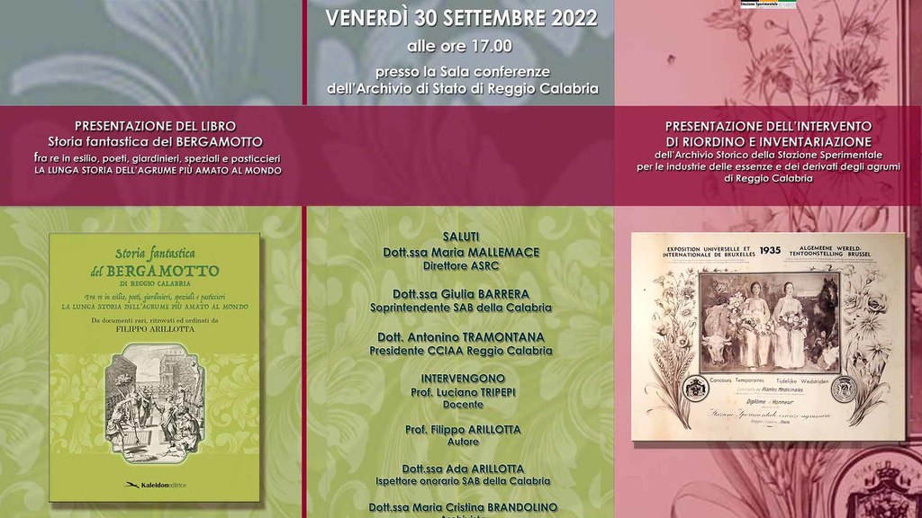 Presentazione del libro “Storia fantastica del bergamotto di Reggio Calabria. Fra re in esilio, poeti, giardinieri, speziali e pasticcieri. La lunga storia dell’agrume più amato al mondo”, di Filippo Arillotta.