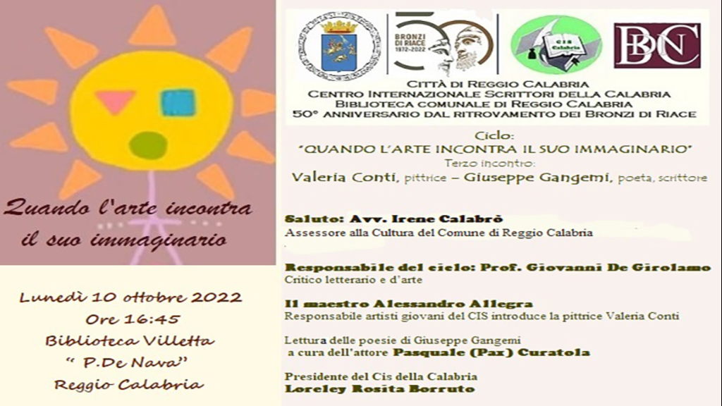 Il Comune di Reggio Calabria, il Centro Internazionale Scrittori della Calabria e la Biblioteca “P. De Nava” di Reggio Calabria, lunedì 10 ottobre 2022, alle ore 16:45, nell’ambito del ciclo “Quando l’arte incontra il suo immaginario”, organizzano il terzo incontro con Valeria Conti, pittrice e Giuseppe Gangemi, scrittore. È quanto si legge in un comunicato del CIS Calabria.