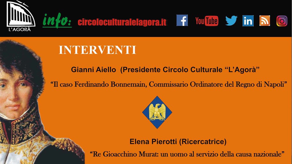 Mercoledì 13 ottobre sulle varie piattaforme social network presenti in rete, sarà disponibile il nuovo appuntamento, organizzato dal circolo culturale “L’Agorà” e dal centro studi “Gioacchino e Napoleone”, denominato “Gioacchino Murat: un Re tra storia e leggenda”.